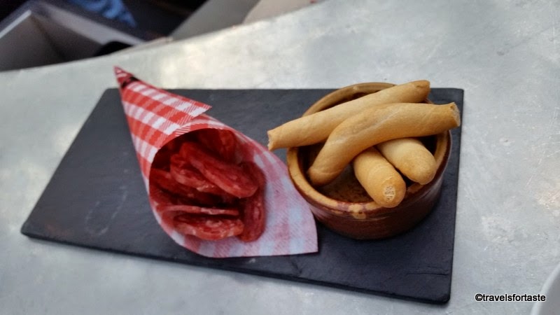 Catalonian cured pork sausage called Fuet served in mini paper cones and midget