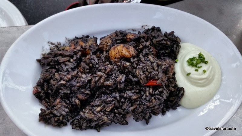 I have always wanted to try squid Ink pasta or rice but never mustered up the courage to work with the squid ink at home. Luckily one of the Tapas served was Arroz negro or black rice with prawns and squid.